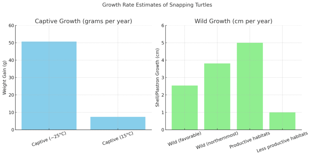 When comparing wild snappers to those raised in captivity, I’ve seen that variability is inevitable. In favorable conditions, they may grow as much as 1–1.5 inches per year, but in low context-dependent settings, growth slows drastically. Many turtle-keeping forums emphasize that no single formula exists—only trends.